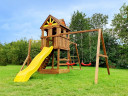 Детский городок Выше Всех Новая Победа 3 это обновлённая модель самого популярного городка, который выпускается с 2015г. и пользуется большой популярностью у наших покупателей. Новая Победа 3 отлично подойдет как для малышей, так и для детей постарше. Малыши могут поиграть в удобной песочнице. Для удобства обустроена лавочка, а для безопасности есть небольшой заборчик, который блокирует случайный выход ребенка из зоны песочницы в сторону качельной балки. Также малыши оценят качели-гнездо.